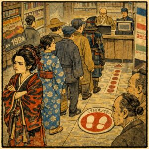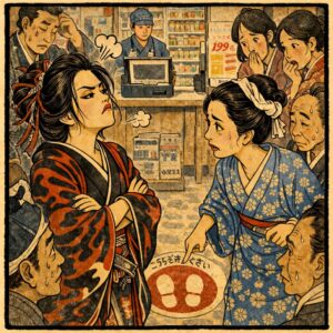その瞬間、周りの客の視線が一斉に商品棚へ逃げた。